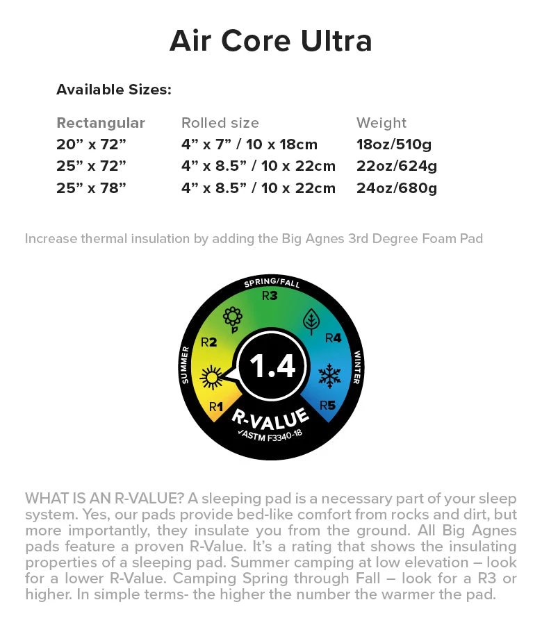 Still the most economical warm-weather pad available, now completely redesigned from the inside out and R-Value rated by a third party. The adventure-ready Air Core Ultra is a smooth and stable sleeping surface for wherever you setup camp. With an easy and fast inflate/deflate valve, tough exterior nylon shell, this pad is light and packable. Save your breath for hauling the rest of your gear and use the included upcycled pad inflation sack to inflate.