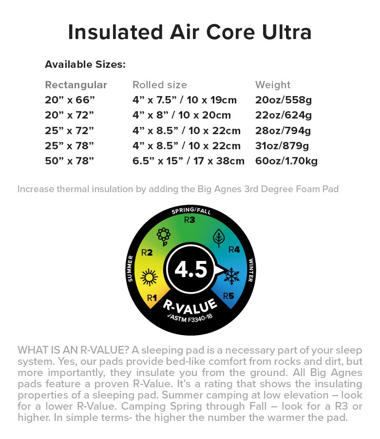 Like the Air Core Ultra, the Insulated Air Core Ultra offers unparalleled comfort at an incredible price. This light and compact three-season insulated pad has been completely redesigned from the inside out and R-Value rated by a third party. Designed with a smooth and stable sleeping surface made with durable nylon rip-stop and larger outside tubes to cradle you on top. Warm and highly packable insulation on top and bottom make this air pad lighter on your pack than most in its class. Save your breath for the adventure ahead, and use the included upcycled pad inflation sack to inflate.
