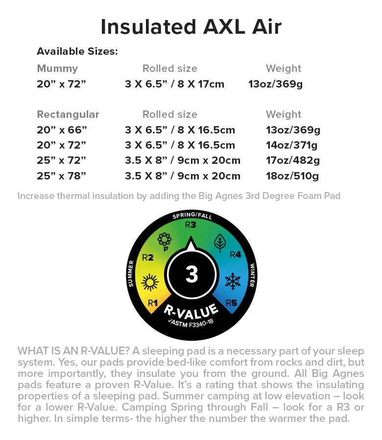 The lightest, most packable, ultralight three-season pad for reliable performance. Completely redesigned from the inside out and R-Value rated by a third party, the Insulated AXL Air pad combines a high-tenacity proprietary nylon rip-stop shell with minimalist internal construction to maximize every ounce for stability and comfort. Constructed with large outer tubes to keep you cradled on top, PrimaLoft® Gold Insulation with Cross Core™ traps body heat and reflects it back, achieving previously unattainable levels of lightweight warmth. Save your breath for dawn patrol, and use the included upcycled pad inflation sack to inflate.