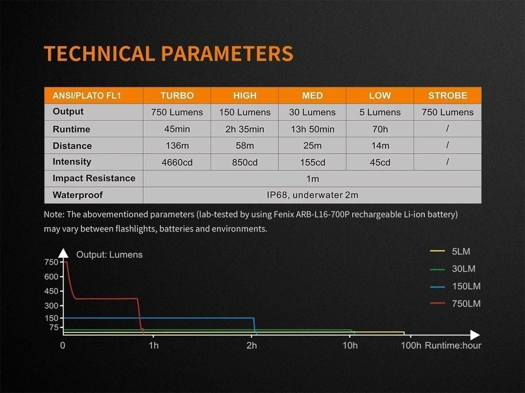 *Note: The abovementioned parameters (lab-tested by using Fenix ARB-L16-700P rechargeable Li-ion battery) may vary between flashlights, batteries and environments.