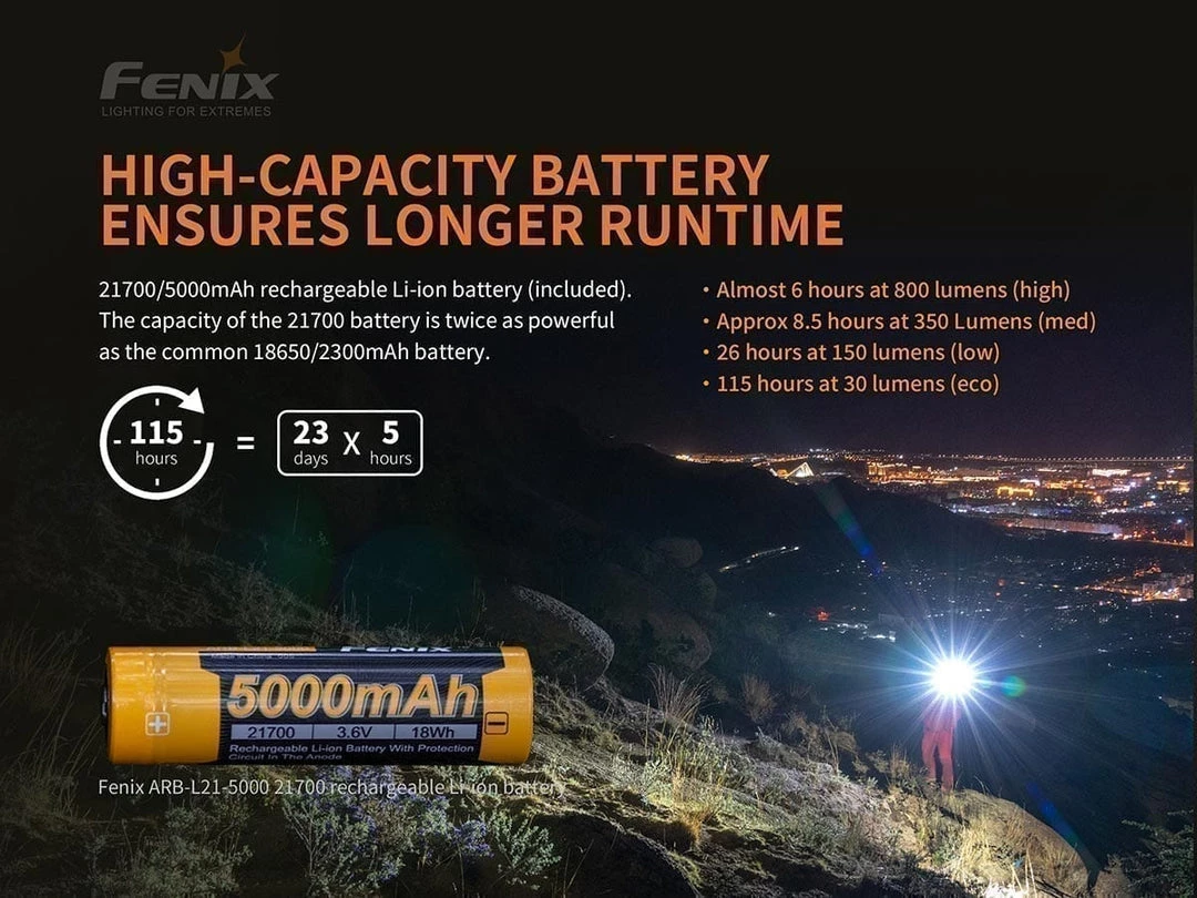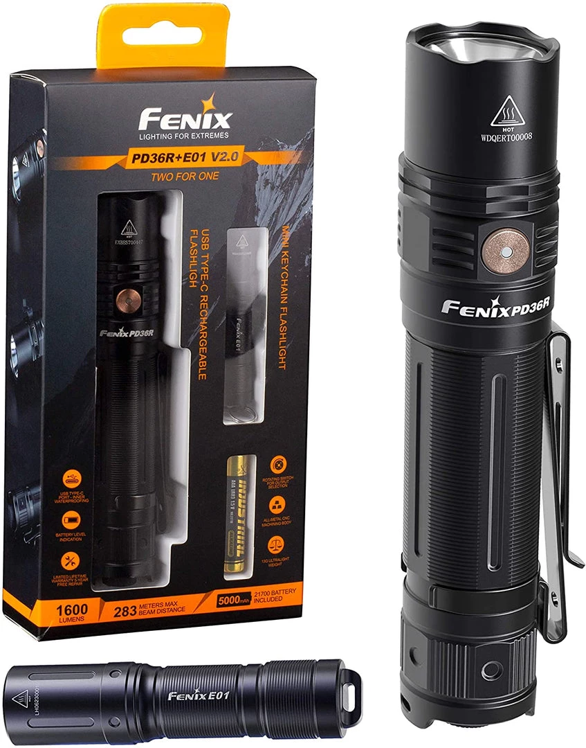 The Fenix PD36R rechargeable flashlight is a high-performance flashlight unlike anything else on the market for its size. This LED rechargeable flashlight delivers a maximum 1600 lumens to an impressive distance of 928ft (283m), all on a high capacity 21700 li-ion battery. The Fenix PD36R is our first introduction of a product with a 21700 li-ion battery, extending battery runtimes by twice the standard li-ion battery. The high-capacity 5000 mAh battery can be conveniently charged through the USB-C port on the flashlight. Additionally, you will always be able to see the battery’s charge status at a glance with the external battery level indicator.