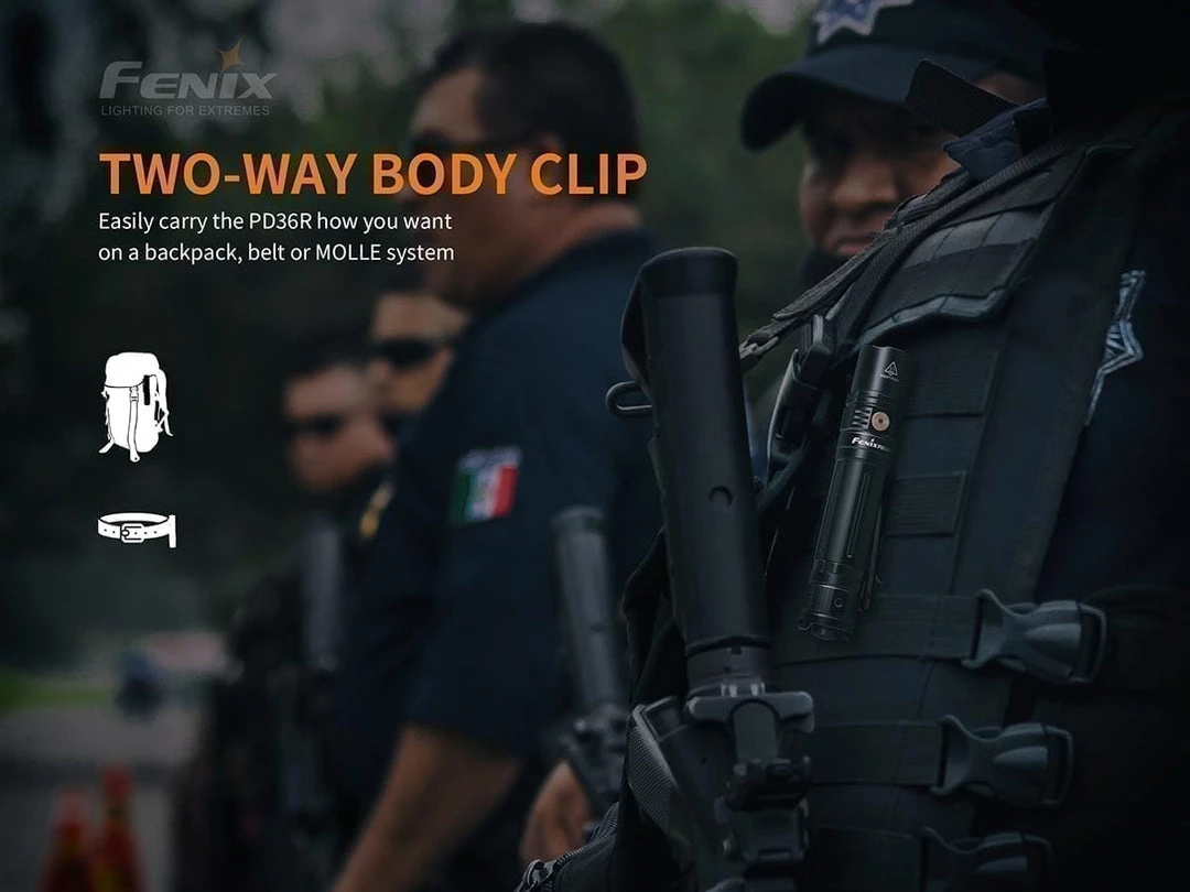 Operating this powerful LED rechargeable flashlight is simple with the tactical tail switch for momentary on/off, and the ability to cycle through six lighting modes using the side switch including a 1600 lumen turbo mode. Carry the Fenix PD36R how you want—on a backpack, belt, or MOLLE system with the two-way body clip. The amount of power and runtime packed into this flashlight are unmatched for its handheld size. IP68 rated dustproof and waterproof, this flashlight is the perfect all-purpose lighting tool for those needing maximum brightness and long runtimes.