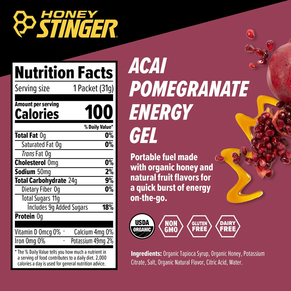 Resembling our popular Pomegranate Passionfruit Energy Chews in taste; the delicious flavor of Acai Pomegranate will not disappoint. Certified Gluten-Free with organic tapioca syrup, organic honey, added electrolytes and a blend of natural acai and pomegranate flavors, this gel will keep you fueled for any athletic endeavor.