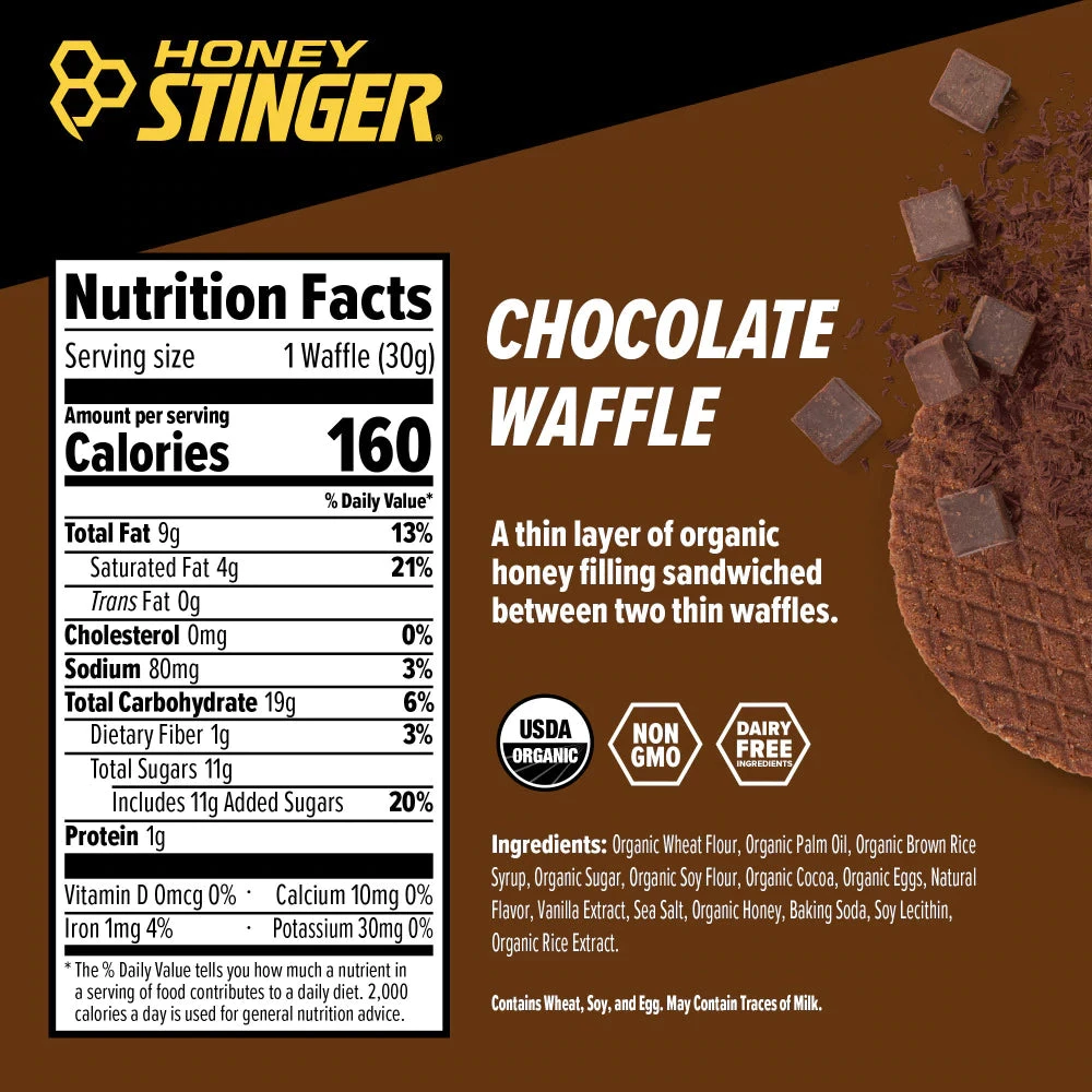 For years, similar waffles have been sold on street corners throughout Europe and eaten by professional cyclists, so we decided to create our own by sandwiching honey between two thin waffles. Honey Stinger Waffles are easy to digest, certified organic and available in a single-serving wrapper.