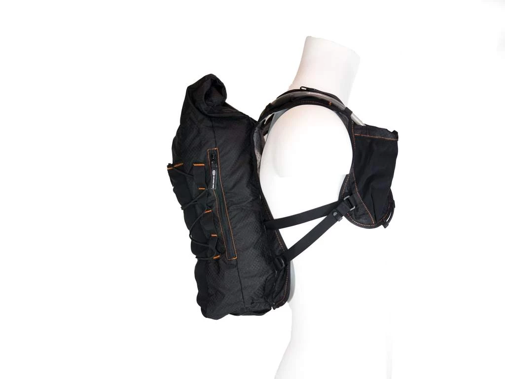 Front: The chest pockets fit plus sized phones and 600ml soft flasks. The two small pockets in front of the flask pockets are for gels/trash/etc and the two shoulder pockets are for your phone, chapstick, and nutrition. The elastic chest harness works wonderfully for ladies and just as well for guys. Sizing is versatile from very petite up to about a 52″ chest.