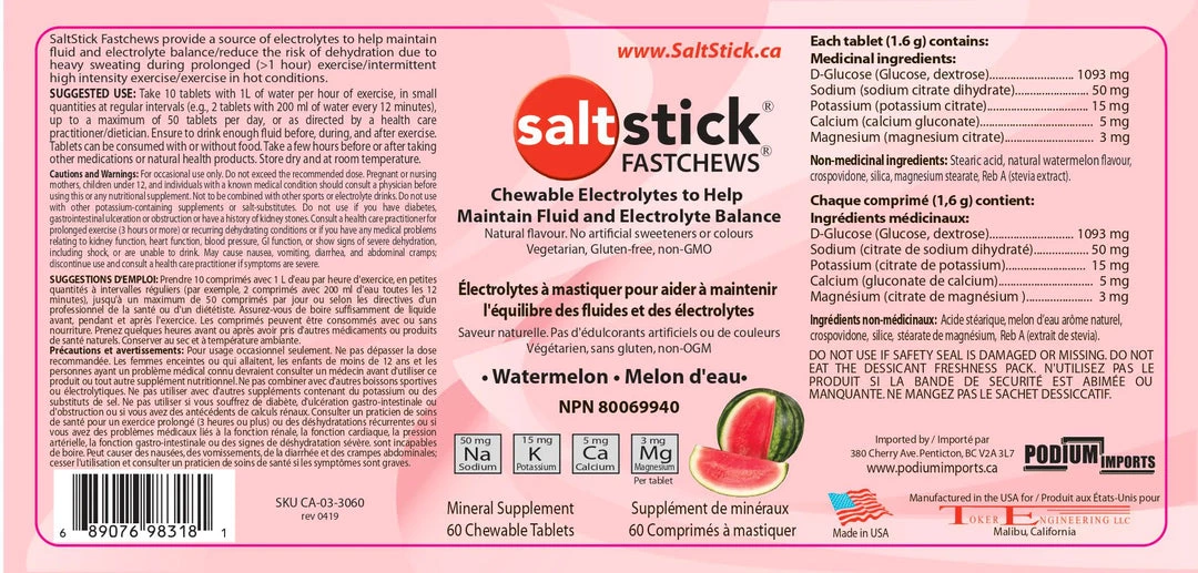 SaltStick FASTCHEWS have been formulated to provide electrolytes to help minimize heat stress and muscle cramping due to perspiration, in a quantity and form which your body can absorb. This product is ideal for athletes, outdoor workers or for use in hot conditions. Two FASTCHEWS in an hour equate to 100 mg sodium, 30 mg potassium, 10 mg magnesium, and 6 mg calcium per hour, which is the ideal ratio to keep you moving.