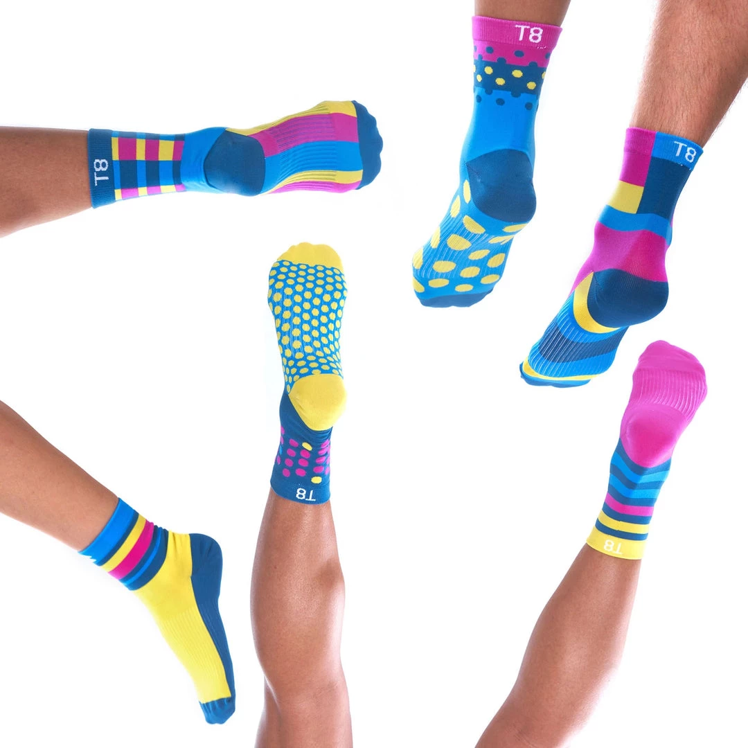 Stripes with spots, or plaid with dots… Now sold in pairs, our Mix Match socks feature mixed patterns and matching colours, so have some fun and pair as you like! And best of all, just like our popular Run Socks, the lightweight stretch construction is designed to prevent blisters and chafing on your runs.Â
