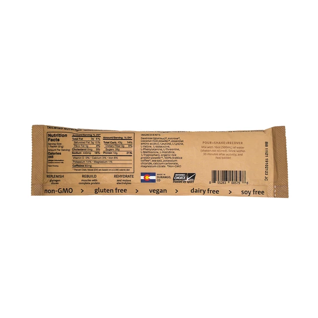 Tailwind’s Caffeinated Recovery Drink is the first sport recovery drink based on a patent-pending perfectly complete protein. We start with organic rice protein, and supplement it with amino acids to make that protein complete. Then we add carbohydrates, some healthy fats from coconut milk, and just the right amount of electrolytes. Nothing repairs your muscles more efficiently, restores your energy faster, and makes you feel better sooner. With 80 mg of caffeine from 100% Arabica coffee, it will help you wake up while you recover! And athletes love the great tasting healthy vegan ingredients.